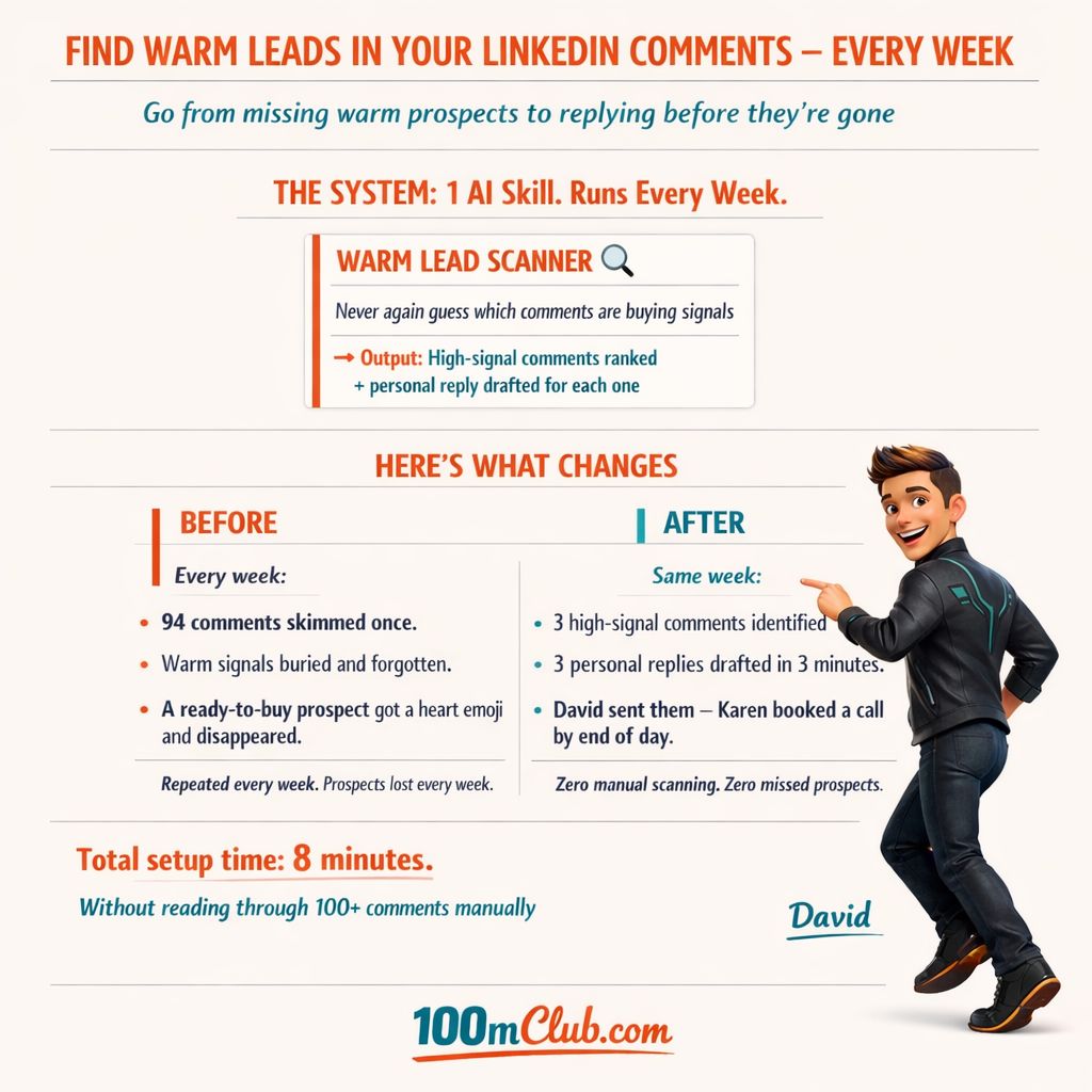 ❌ What David had: "112 comments across 5 posts this week. Replied to 15. Liked the rest. Three possible leads somewhere in there — no idea who."