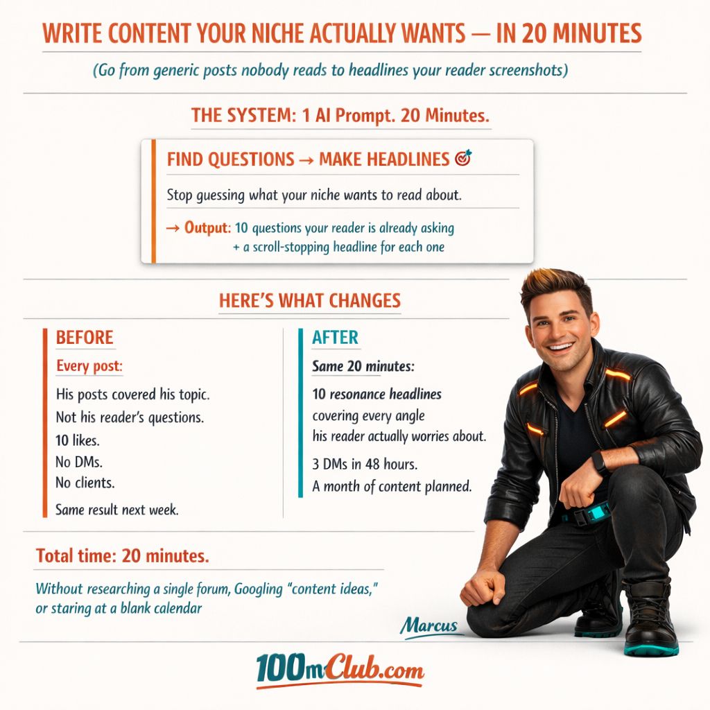 His AI sidekick handled the audience research and headline writing. Marcus picked the angles that fit his voice and got to work. BAM.